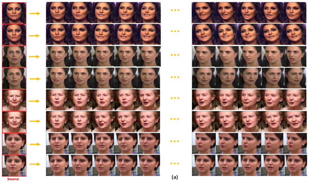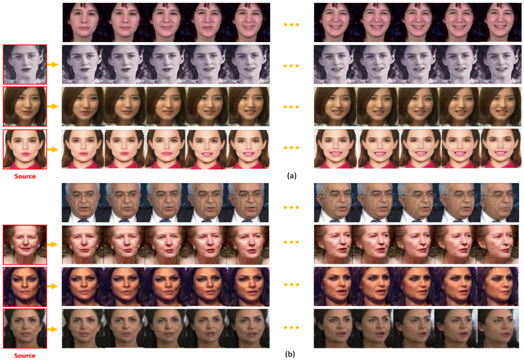 FaceAnime的人脸表情重定向(a)和头部讲话重定向(b)实验结果