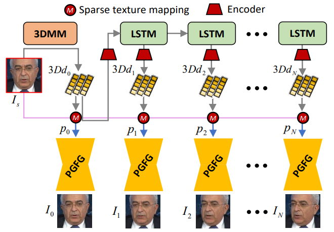 提出了一个稀疏纹理映射算法来渲染预测的3D动态序列,并将其作为先验信息引导人脸图像/视频的生成;