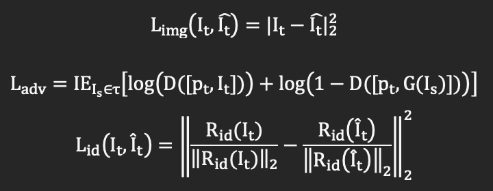 需要注意的是,在身份信息损失中,R为预训练的人脸识别模型。网络整体的损失函数为: