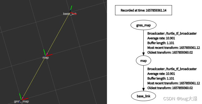rviz界面显示的是坐标变换的关系;(左侧添加tf插件:层次也是与tf_tree一致)。