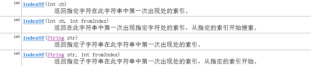 int | indexOf(int ch)返回指定字符在此字符串中第一次出现处的索引。 |