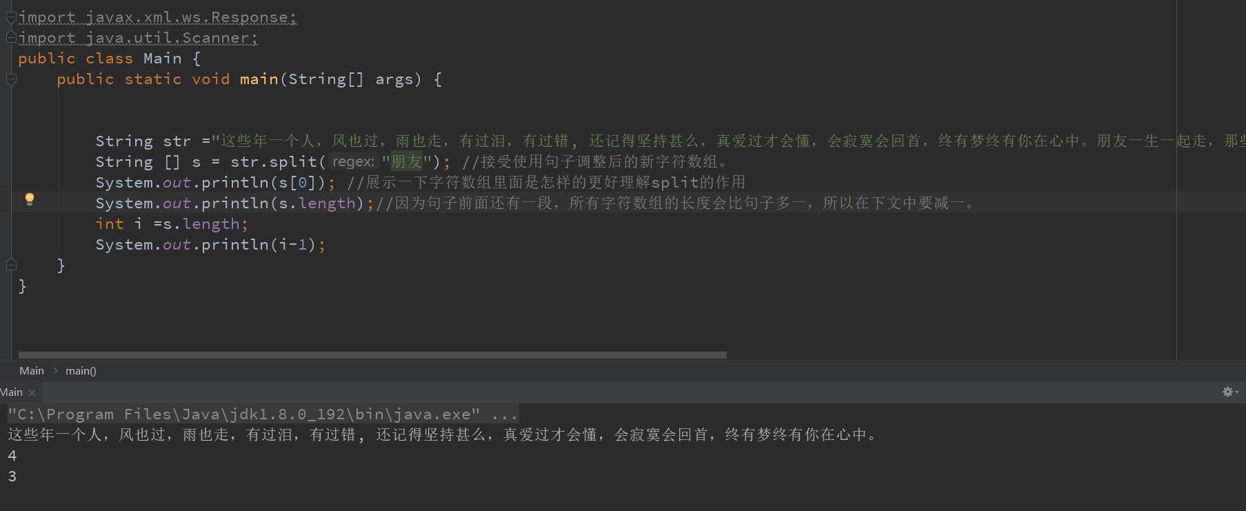 这里使用了一个关键的方法,但是感觉这个有点偏门,就是split,这个解释起来有点复杂,打个比方它可以将一个字符串中你选定的字符,或者字符串作为一个“句号”来进行使用,然后你用这个句号来拆分你的字符串,而且他的返回值还是还是字符数组,而且这个字符数组的返回形式是以你句号的位置来定的。然后,又因为字符数组的里面存的字符数据多少,跟你的“有关系”,这样你就可以根据字符数据,来判断你的“句号的”数据信息。简直蛋疼。