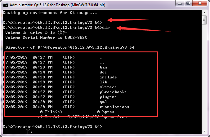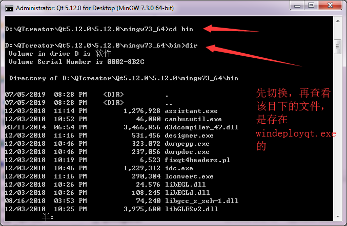 点击运行后,他直接就是在这个目录下了:使用dir命令可以查看该目录下有哪些文件,我们的windeployqt.exe是在bin下的,所以还要切换一下,输入命令cd bin 就可以切换进去了
