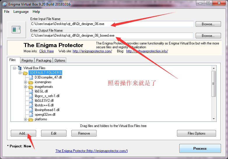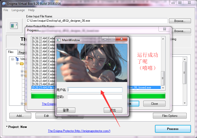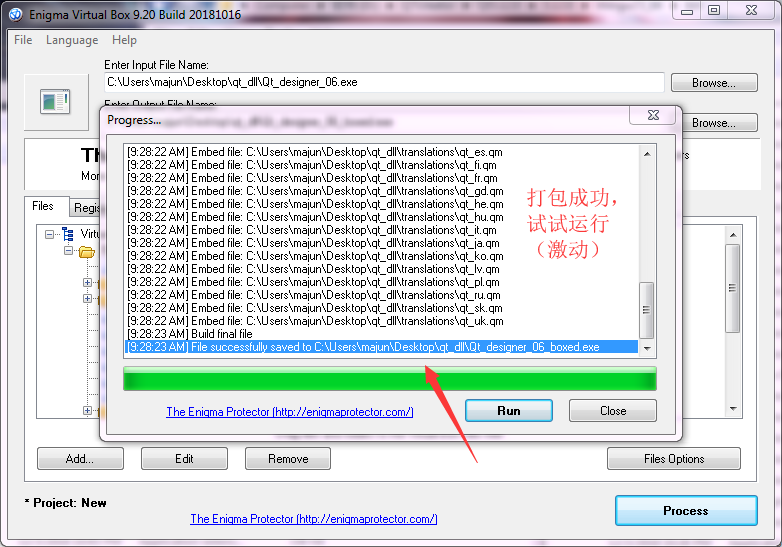 这下可以运行了,那再用Enigma Virtual Box.exe给打个包吧,下载地址:https://enigmaprotector.com/en/downloads.html有免费的,下载安装吧