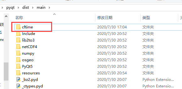 2.打包后会得到下面的文件夹,仔细看这个目录下是没有错误提示的那个cftime模块的,这就是错误的原因。
