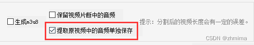 继续勾选提取原视频中的音频单独保存,提示,分割后的视频长度会有一定的误差。