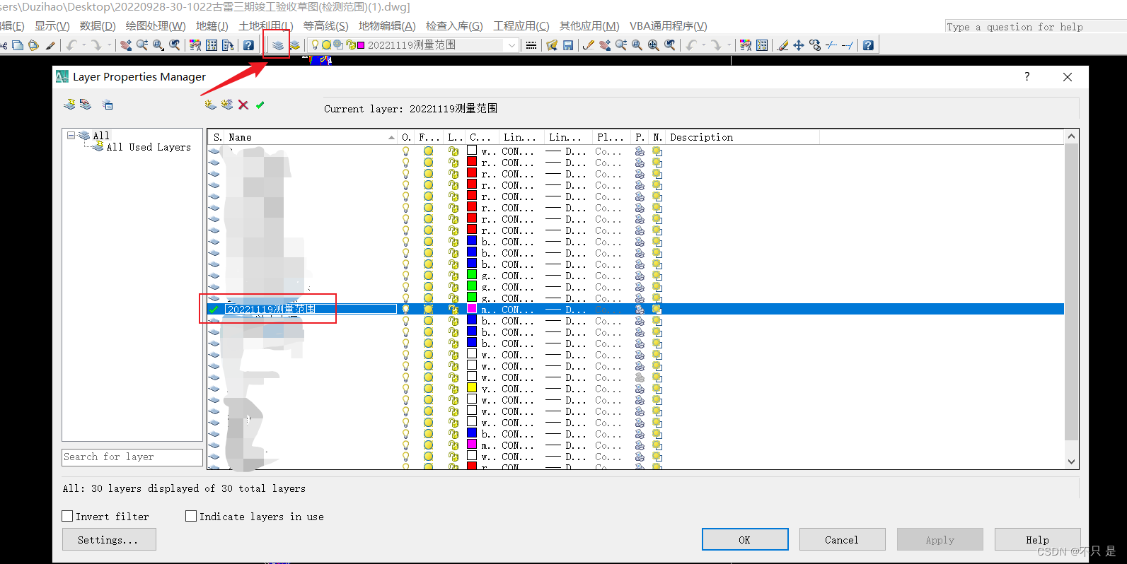 1.首先观测,在一整张图中,计算N块面积时,这些块是否在同一个图层,如果在同一个图层可用此方法,如下图,要计算,N多个图层中的其中一个图层的面积,