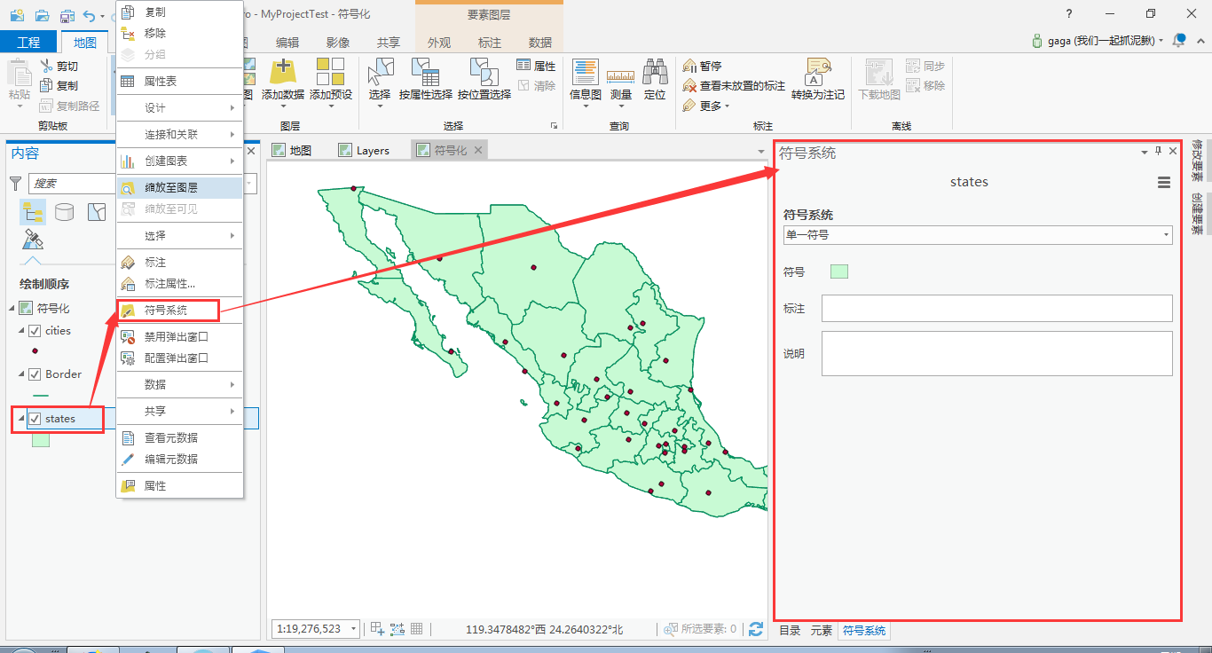 4、对states面要素进行符号化,打开符号系统窗口(注意:以前Map中符号系统是在图层属性窗口中的,现在符号系统已经变成了一个单独的窗口)