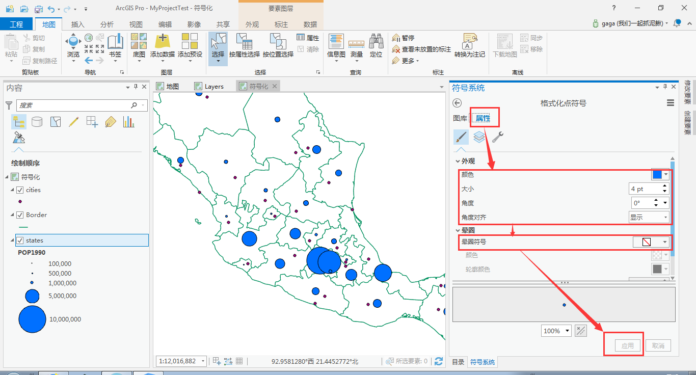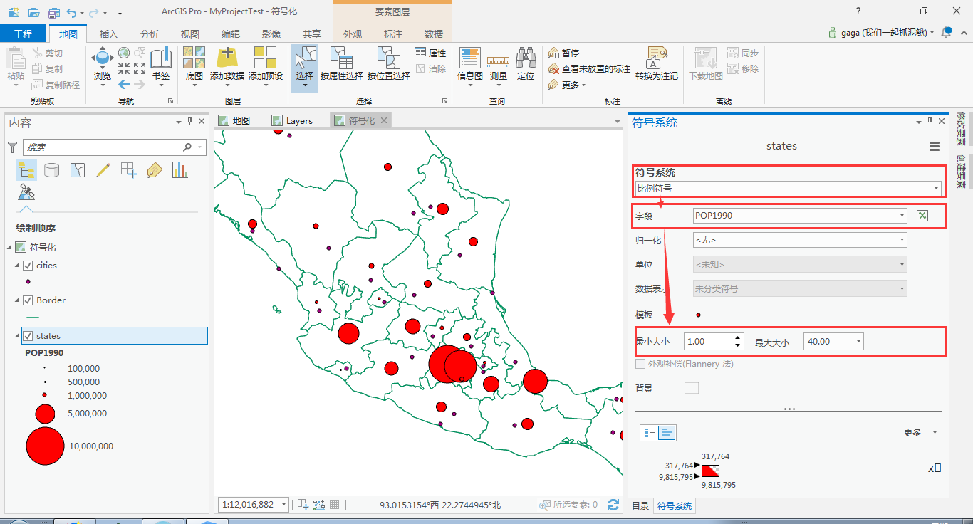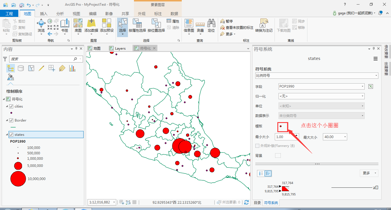 选择符号化系统中的比例符号,设置基于的字段:POP1990,设置符号形状的最大最小值。