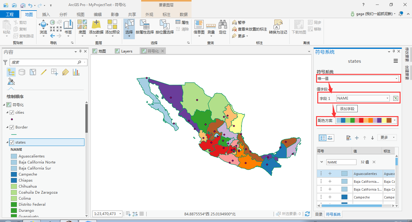 选择符号化系统中的唯一值,设置分类的值字段:NAME,选择合适的配色方案。
