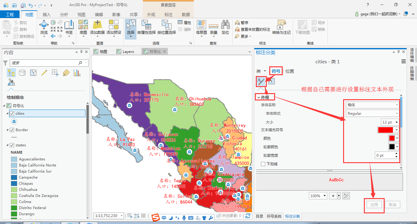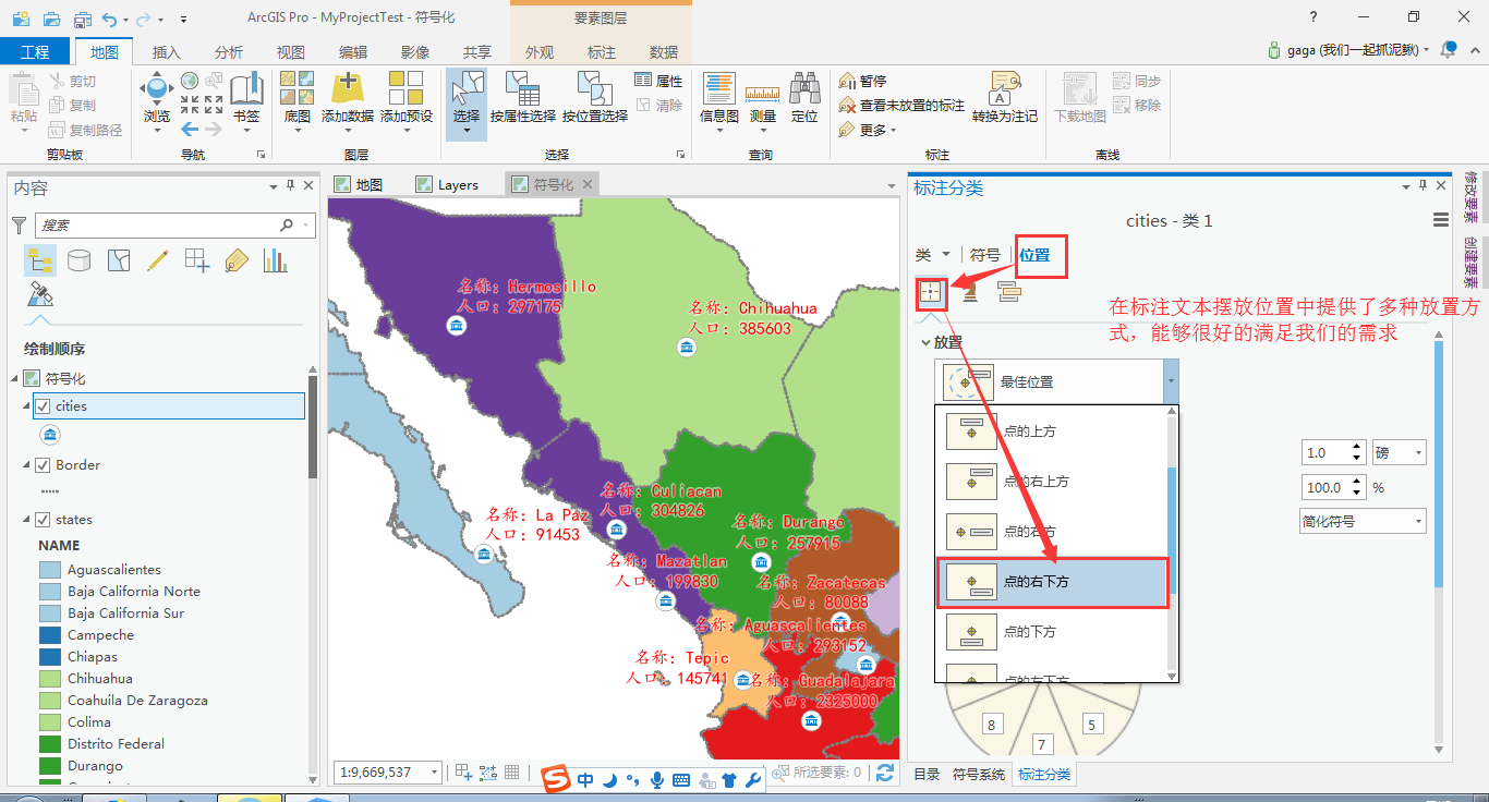 至此简单的一个符号化和标注工作就完成了,为明天开心的制作一幅精美的专题图做好了前期的工作。在标注属性窗口中,里面其实有很多的样式和功能,比如晕圈,设置字体轮廓等等,大家可以根据自己的需求进行设置。