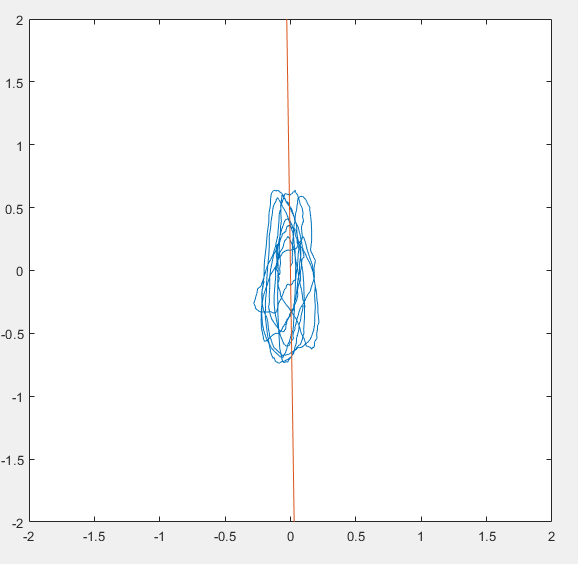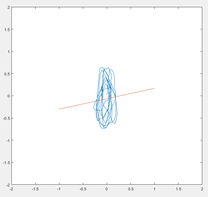 在实际使用polyfit拟合一次函数时发现,该函数更倾向于拟合出斜率小于1的一次函数,如图所示,当数据点明显趋于纵向排列时,拟合出的直线仍趋于水平