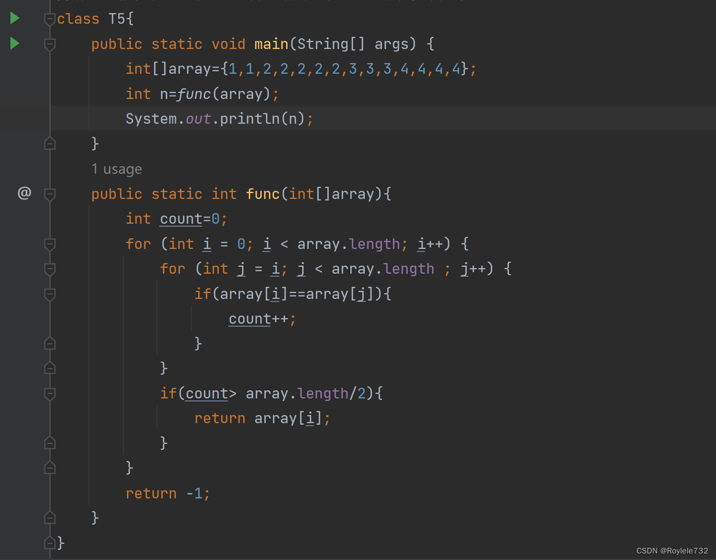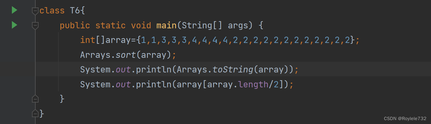 方法二:Arrays.sort();排序,则排在最中间的数据就是出现次数大于n/2