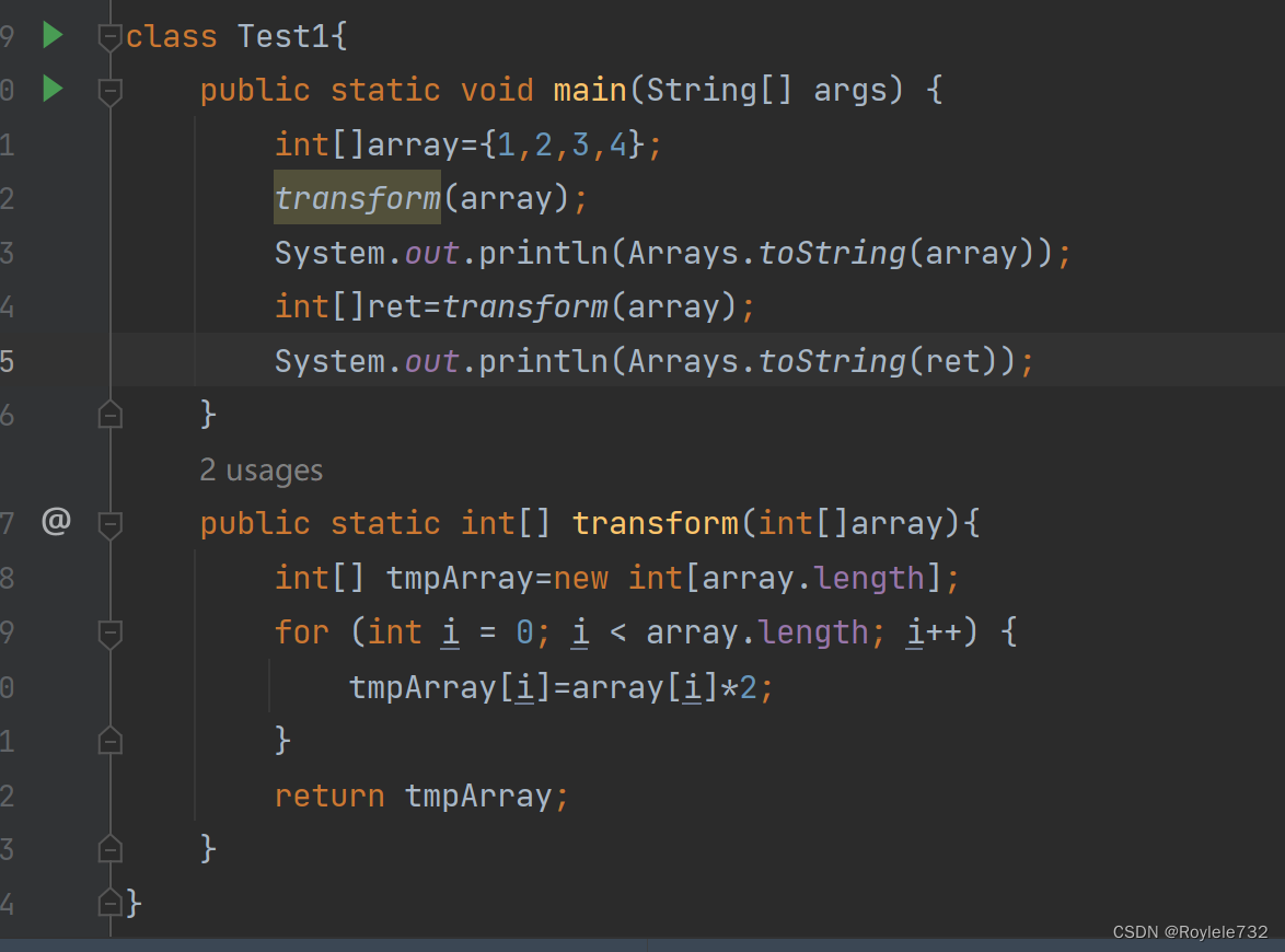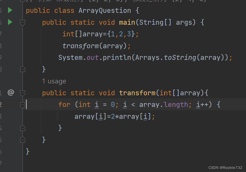 实现一个方法 transform, 以数组为参数, 循环将数组中的每个元素 乘以 2 , 并设置到对应的数组元素上. 例如 原数组为 {1, 2, 3}, 修改之后为 {2, 4, 6}