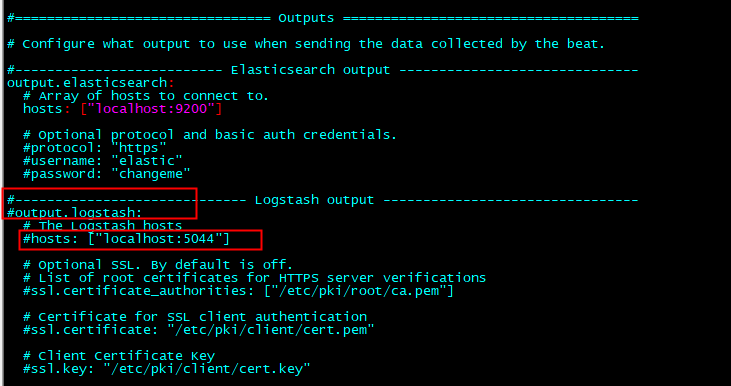 output有多种输出模式,可直接输出到logstash、elasticsearch、kibana和redis,根据实际需要选择,这里选择输出到logstash