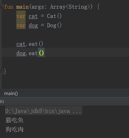 open class Animal { open fun eat(){ println("吃......") } } class Dog : Animal() { override fun eat() { println("狗吃肉") } } class Cat : Animal() { override fun eat() { println("猫吃鱼") } }