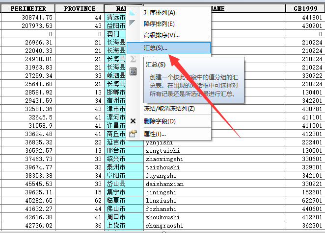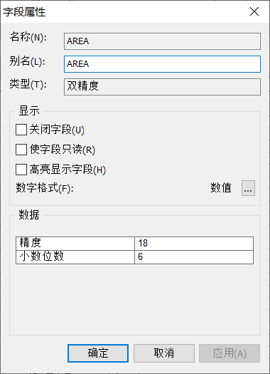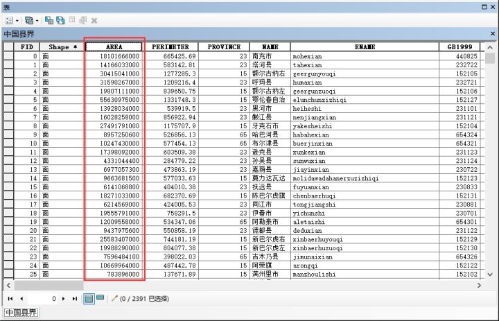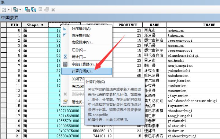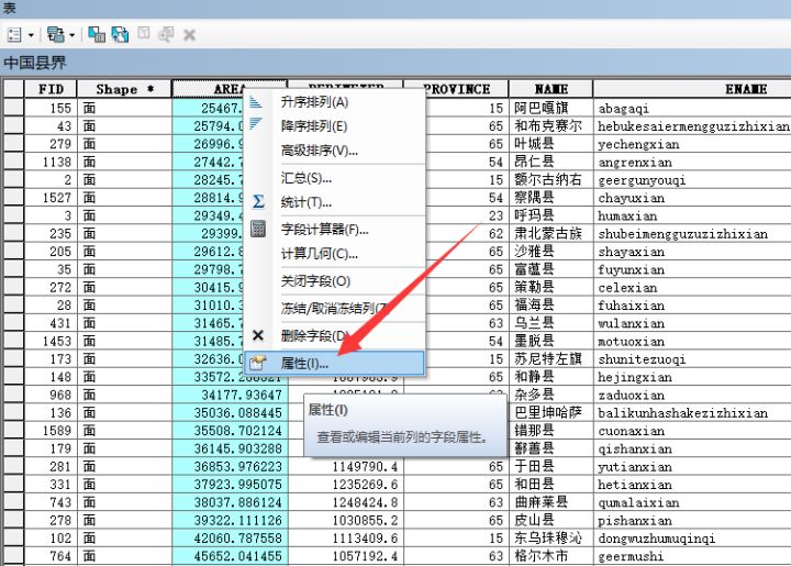 我们重新打开属性表,看看其中的一些功能。这里我们以属性字段面积(AREA)为例。你应该很好奇这里的面积格式你看不懂对吧