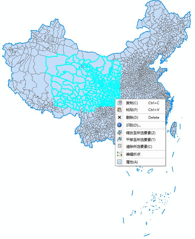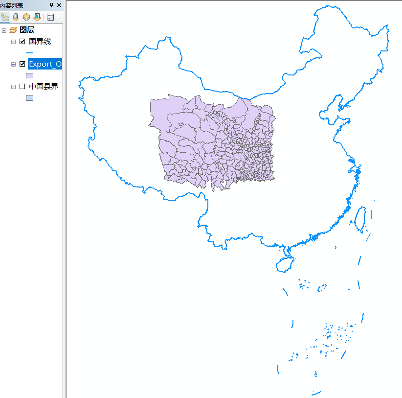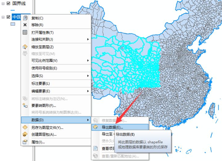 导出就有点多一点操作了。首先你需要选中需要导出的数据,这里就如上。现在你可以在中国县界右键弹出的选项栏中选择【数据】/【导出数据】