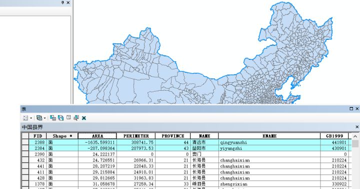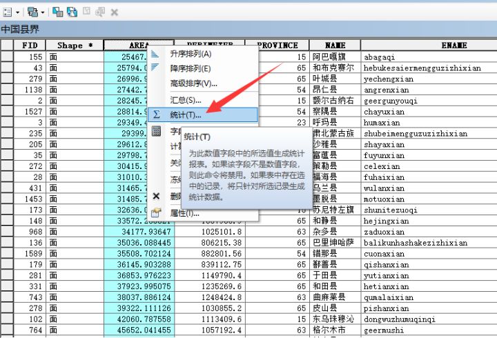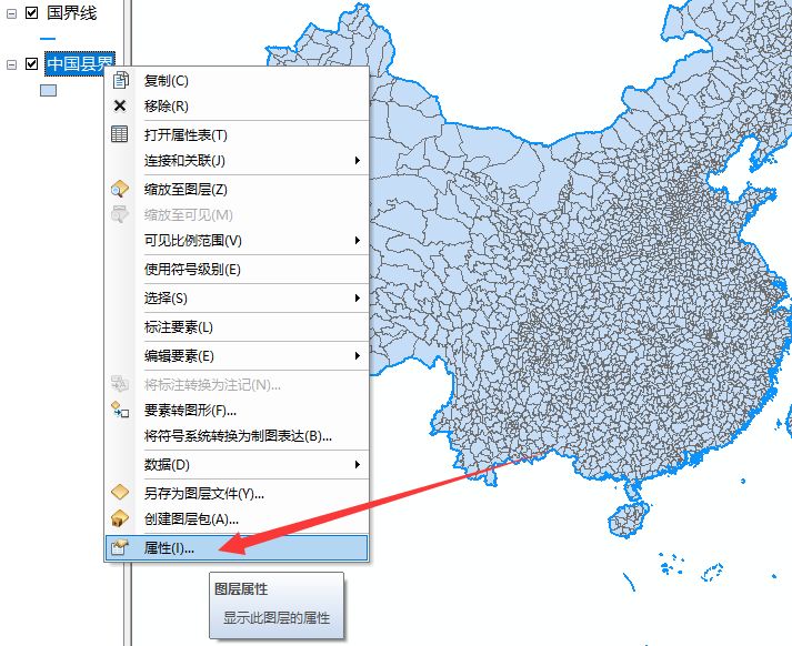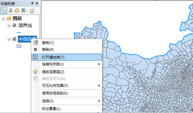 中都可以看到。你只需要在加载的数据(中国县界)上鼠标右键,在弹出的选项栏中点击【打开属性表】