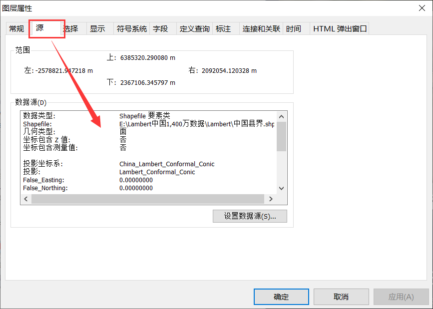 在图层属性中的源选项中我们可以看到数据的一些基础信息,例如数据类型、投影等等信息。