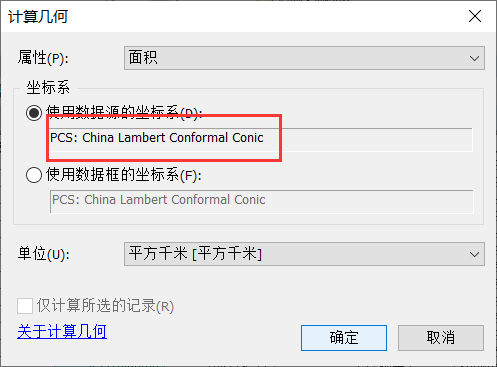 你只要把单位改成平方千米就可以(这里修改面积单位必须得有投影,因为数据本身就是兰伯特投影就不要修改了)