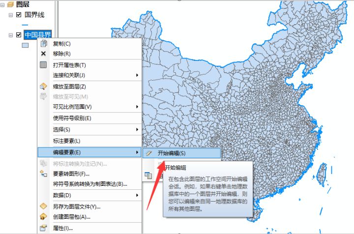 首先编辑数据我们要开始编辑,你只需要在中国县界右键弹出的选项栏中点击【编辑要素】/【开始编辑】