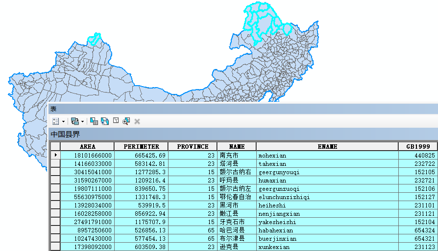 数据的属性表打开了,我们在里面可以看到很多信息,包括每个区域的名称、面积、周长等等。只要你选中一个属性区域就会在图层上显示高亮显示。当然属性表中还有很多操作,我们慢慢来看。