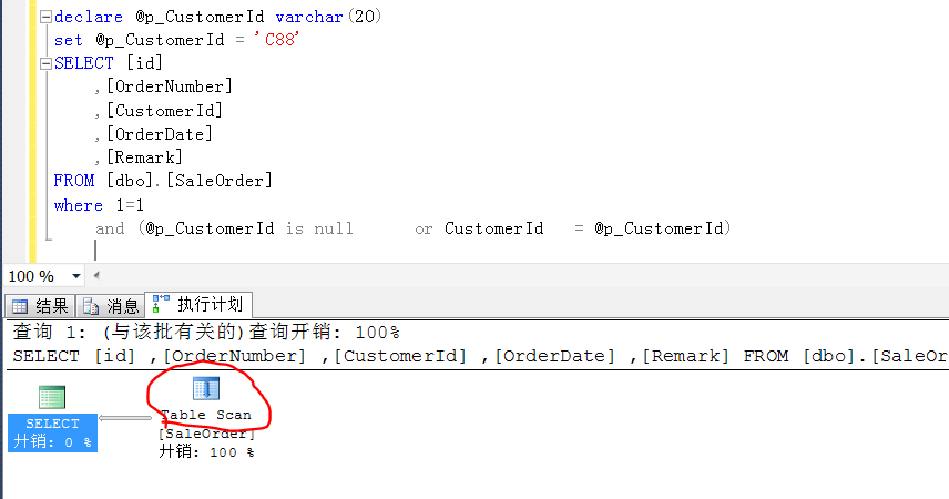 如果我直接带入CustomerId=‘C88’,再来看执行计划,结果跟上面一样,但是执行计划是完全不一样的,这就是所谓的抑制到索引的使用。