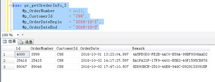 假如我们查询CustomerId为88,在2016-10-1至2016-10-3这段时间内的订单信息,如下,带入参数执行