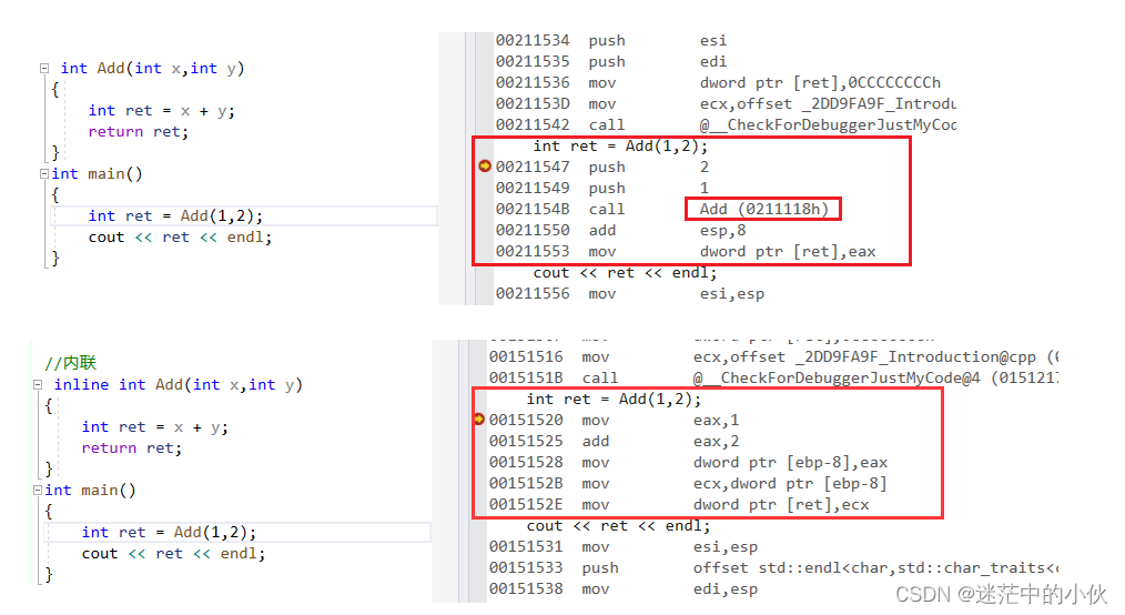 1. 在 release 模式下,查看编译器生成的汇编代码中是否存在 call Add2. 在 debug 模式下,需要对编译器进行设置,否则不会展开 ( 因为 debug 模式下,编译器默认不会对代码进行优化 )