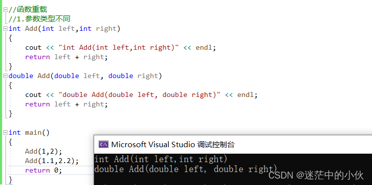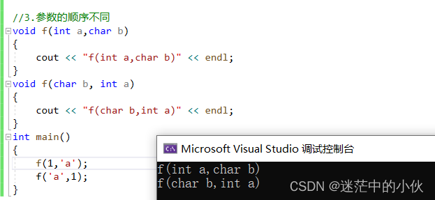 函数重载 : 是函数的一种特殊情况, C++允许在同一作用域中声明几个功能类似的同名函数 , 这些同名函数的形参列表(参数个数 或 类型 或 顺序)必须不同 ,常用来处理实现功能类似数据类型不同的问题