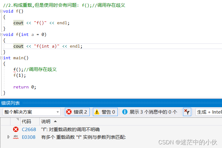 ③构成重载,但是一个存在默认参数,一个不存在默认参数,如下示例,会产生二义性