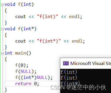 f(NULL)和f(0)对应的都是f(int),而程序本意是想通过f(NULL)调用指针版本的f(int*)函数,但是由于NULL被定义成0,因此与程序的初衷相悖。而在C++98中,字面常量0既可以是一个整形数字,也可以是无类型的指针(void*)常量,但是编译器默认情况下将其看成是一个整形常量,如果要将其按照指针方式来使用,必须对其进行强转(void *)0, 所以在C++11中,引入了新关键字nullptr。