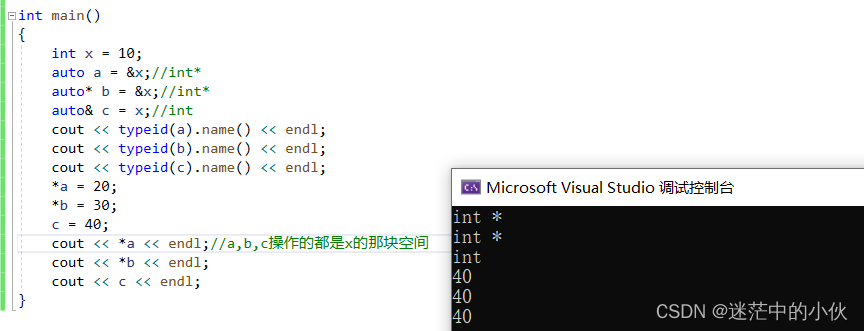 [注意]使用 auto 定义变量时必须对其进行初始化,在编译阶段编译器需要根据初始化表达式来推导 auto 的实际类型 。因此 auto 并非是一种 “ 类型 ” 的声明,而是一个类型声明时的 “ 占位符 ” ,编译器在编译期会将 auto 替换为 变量实际的类型 。