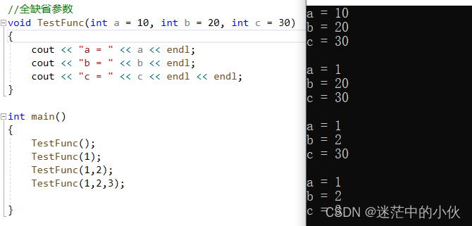 全缺省参数: 即上述a,b,c三个都有缺省参数