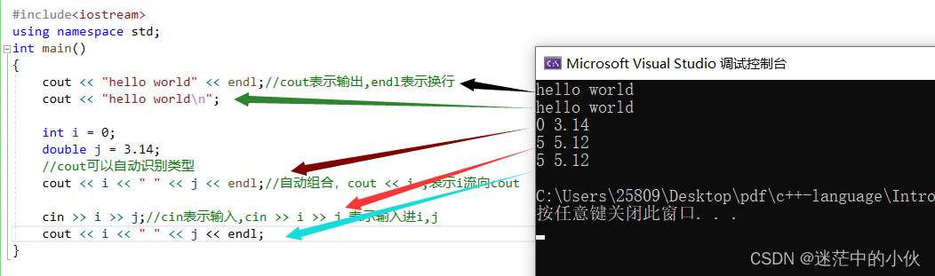 说明:1. 使用 cout 标准输出 ( 控制台 ) 和 cin 标准输入 ( 键盘 ) 时,必须 包含 < iostream > 头文件 以及 std 标准命名空间。注意:早期标准库将所有功能在全局域中实现,声明在 .h 后缀的头文件中,使用时只需包含对应头文件即可,后来将其实现在 std 命名空间下,为了和 C 头文件区分,也为了正确使用命名空间,规定 C++ 头文 件不带 .h ;旧编译器 (vc 6.0) 中还支持 <iostream.h> 格式,后续编译器已不支持,因此 推荐 使用 <iostream>+std 的方式。2. 使用 C++ 输入输出更方便,不需增加数据格式控制,比如:整形 --%d ,字符 --%c