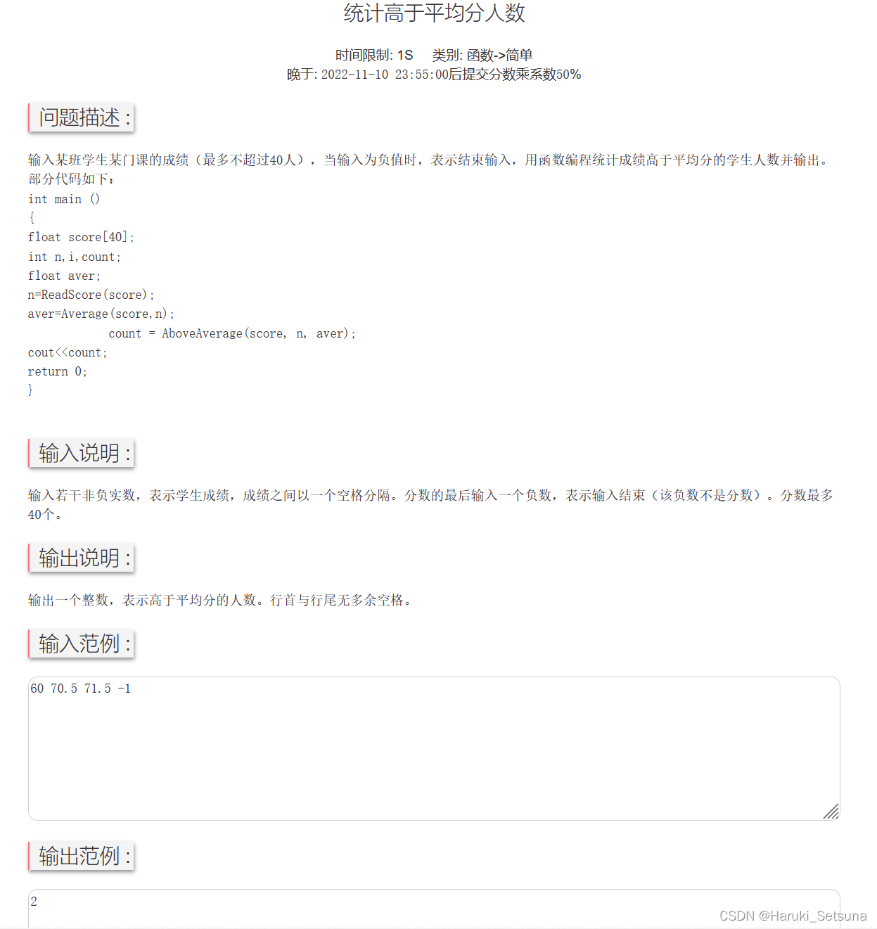 以上就是沉静夕阳最近收集整理的关于东华大学 2022 oj c++ 无超纲写法 统计高于平均分人数的全部内容,更多相关东华大学内容请搜索靠谱客的其他文章。