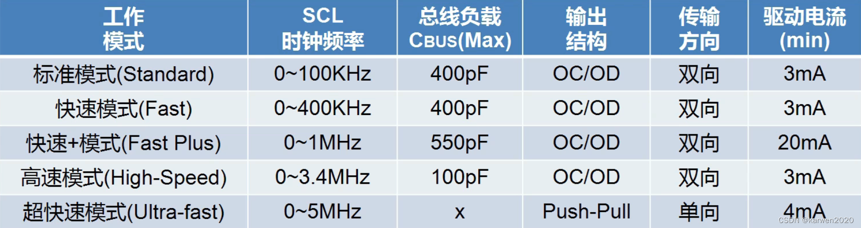 4、标准协议中I2C共有标准、快速、快速+、高速、超高速5种工作速率。