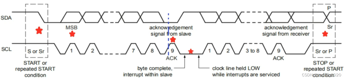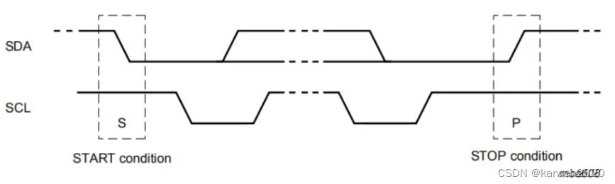 1、开始位/重复开始位(S-Start/Sr-Repeated Start):当SCL为高电平时,SDA由高电平切换为低电平,此时通信开始。