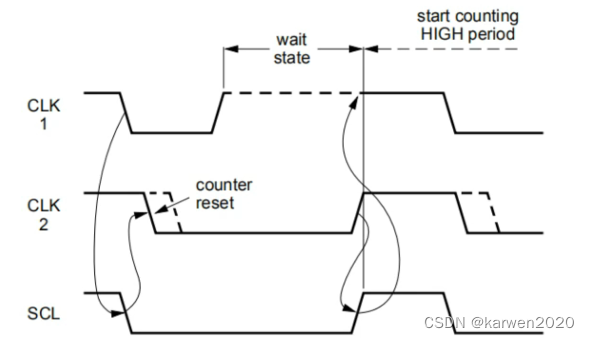6、时钟同步:同一总线上有多个主机同时访问从机时发生,采用SCL时钟(OC/OD)线与的结构,只有当CLK1和CLK2均为高电平时,SCL才表现为高电平,通信开始。超快速模式采用推挽式结构,不支持时钟同步。
