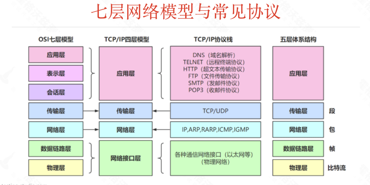 7层模型:物理层、数据链路层、网络层、传输层、会话层、表示层、应用层