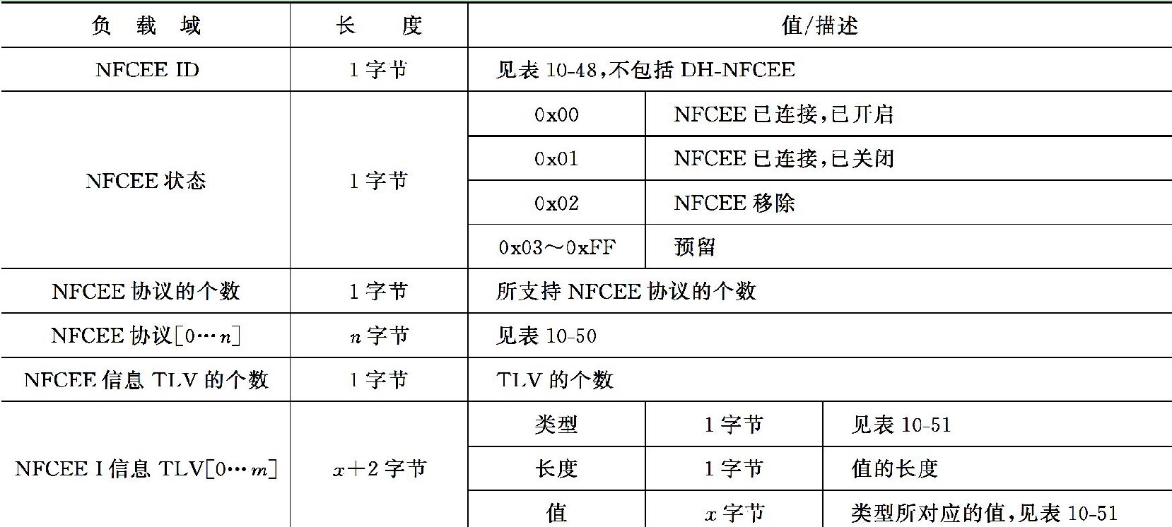 如果至少有一个NFCEE连接到NFCC上,那么对于每一个连接的NFCEE,NFCC都会向DH发送NFCEE_DISCOVER_NTF消息,如表10-49所示。该通告消息中包含NFCEE ID、NFCEE的状态、NFCEE所支持的协议,以及NFCEE的一些额外信息。在NFCEE发现过程中,如果NFCEE发现过程被开启,任何NFCEE的重新连接或移除都会通过NFCEE_DISCOVER_NTF消息通告给DH。如果NFCEE_DISCOVER_NTF中的NFCEE状态为0x02(NFCEE移出),NFCEE协议信息数将被设置为0,并且DH到该NFCEE的逻辑连接也将被自动关闭,相应的NFCEE接口(协议)立即被去激活。如果NFCEE发现过程被关闭,任何NFCEE状态的变化都不会向DH通知。