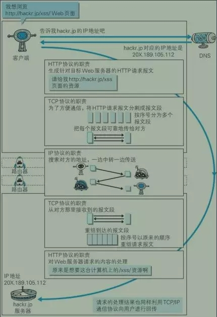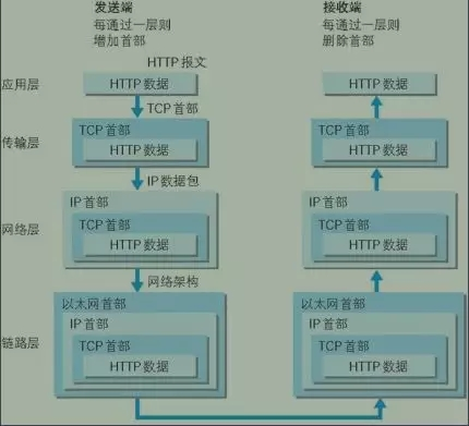 利用TCP/IP协议族进行网络通信时,会通过分层顺序与对方进行通信,发送端会从应用层往下走,即应用层(HTTP客户端),传输层(TCP),网络层(IP),链路层(网络),而接收端则是从链路层往上走的。