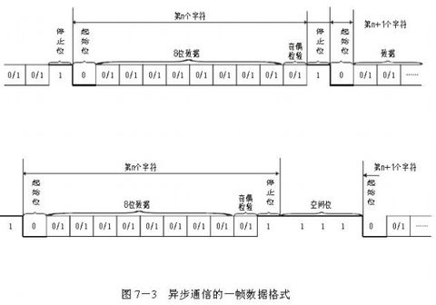 异步通信是我们最常采用的通信方式,我们后面的例子都是采用的异步通信方式。异步通信采用固定的通信格式,数据以相同的帧格式传送。如图7-3所示,每一帧由起始位、数据位、奇偶校验位和停止位组成。