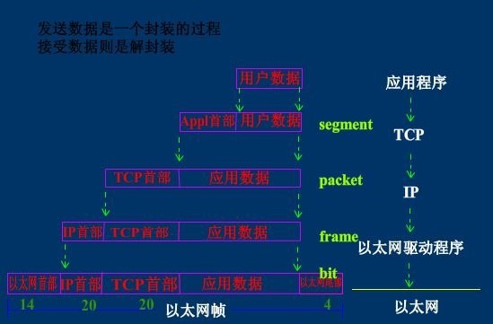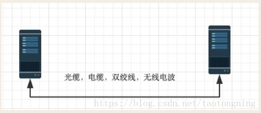 中间的物理链接可以是光缆、电缆、双绞线、无线电波。中间传的是电信号,即010101...这些二进制位。