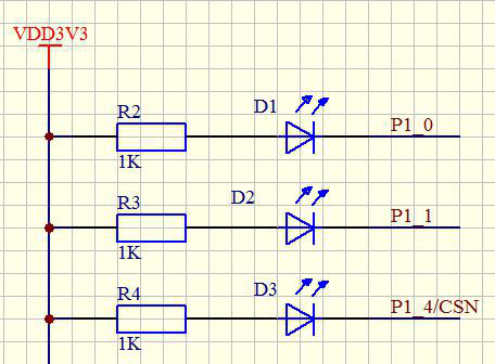 发光二极管是属于二极管的一种,具有二级管单向导电特性,即只有在正向电压(二极管的正极接正,负极接负)下才能导通发光。P1.0引脚接发光二极管(D1)的负极,所以P1.0引脚输出低电平D1亮,P1.0引脚输出高电平D1熄灭,D2,D3同理。