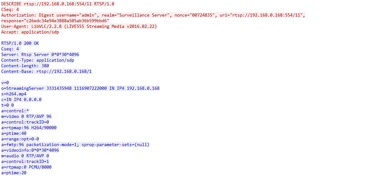 可以看到抓包序列从407到419为客户端与服务端信息交互的过程,从420开始则是服务端用RTP发送过来的音视频流数据。