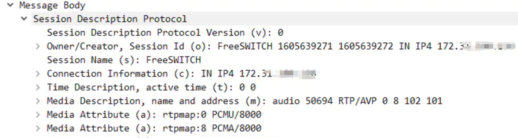 这种网络拓扑结构下,FS发送的INVITE以及回复的200OK中,SDP携带的是内网IP,如下图: