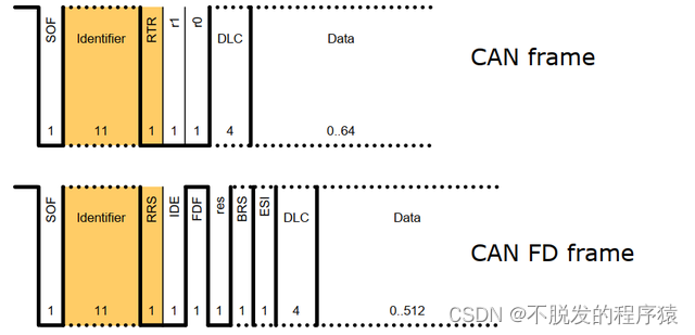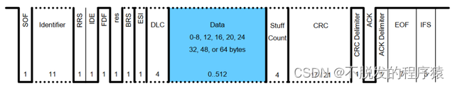 CAN FD与CAN有着相同的IDE、res和DLC位,同时增加了FDF、BRS、ESI三个bit位。
