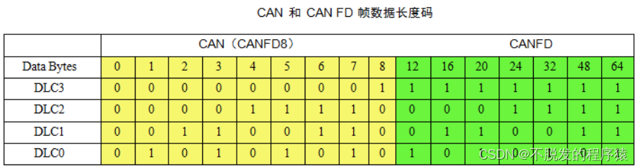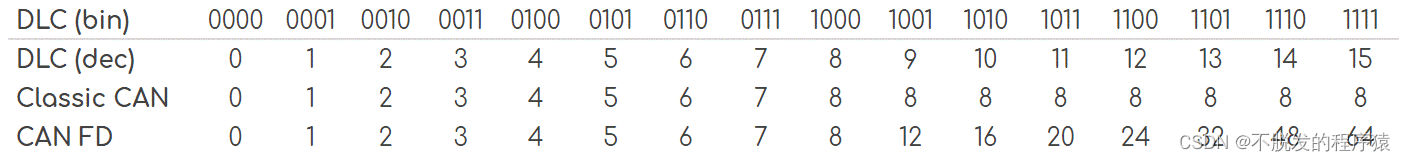 像在传统CAN中一样,CAN FD DLC是4位,表示帧中数据字节的数量。为了维持4位DLC,CAN FD使用从9到15的其余7个值来表示所使用的数据字节数(12、16、20、24、32、48、64)。